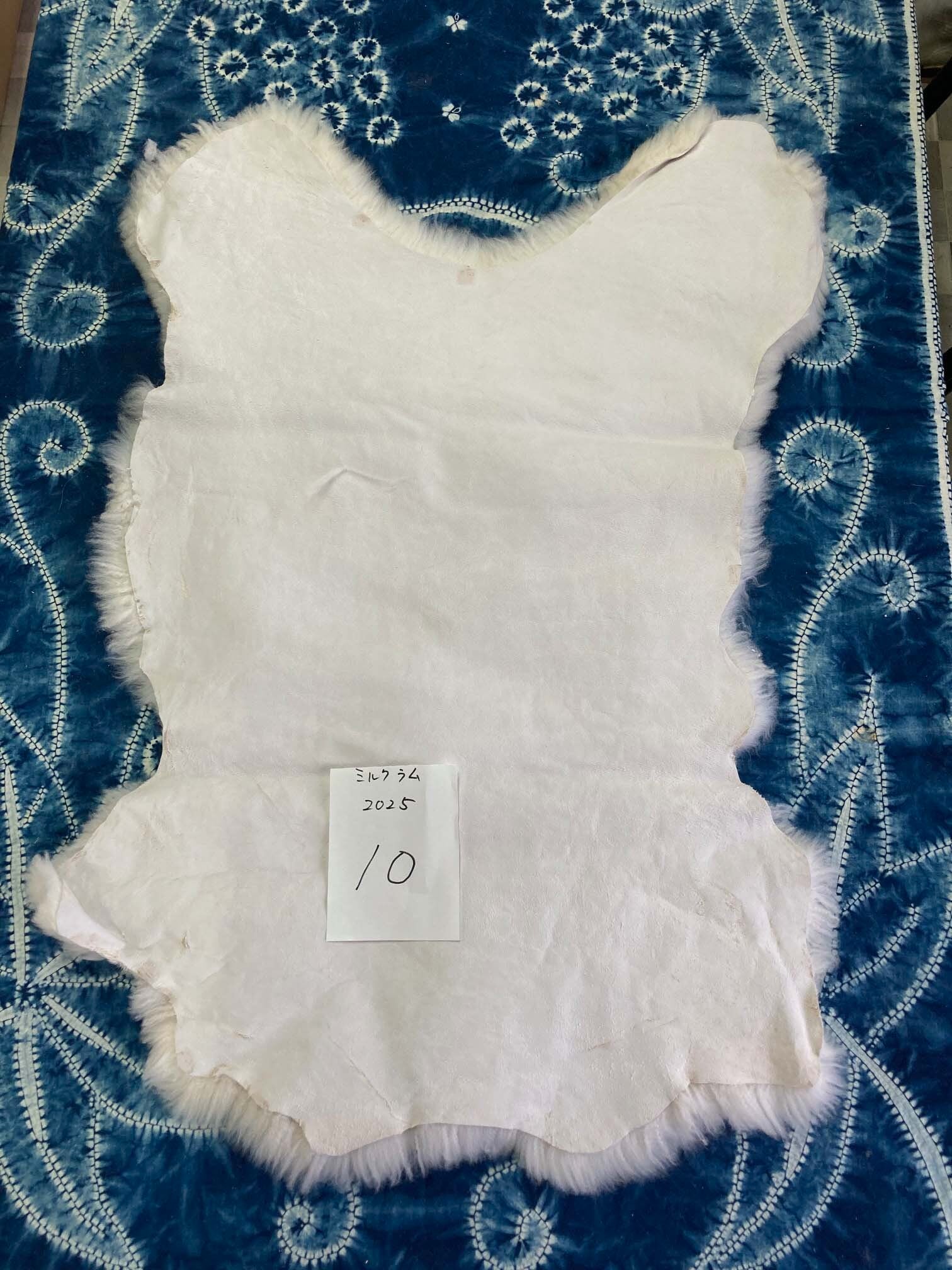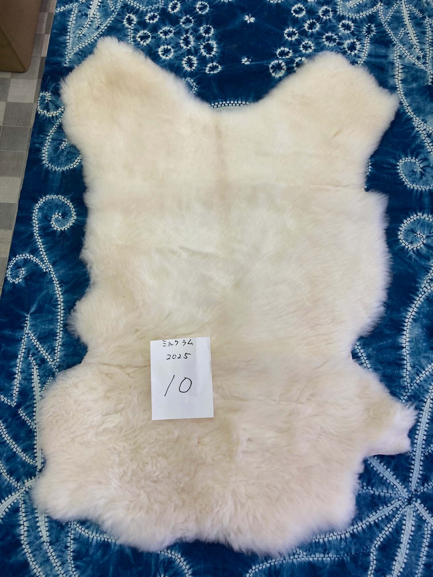 ミルクラムムートン (2025.09.30) ミルクラムムートンの刺し毛です。サイズはタテ73✕ヨコ53センチ。 ※1枚のムートンの中でも、部位によって色合いや毛並みが異なります。 ※サイズはタテ、ヨコそれぞれの中央周辺の長さです。 ※なめしの過程で致し方なく発生する破れは、工場にて表面から見えないよう、裏面から専用のミシンで縫合しています。 33,000円(税込)